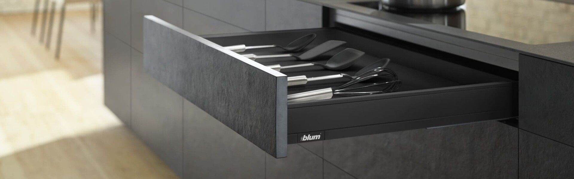 Las bisagras Negro Ónix de Blum llevan esta tendencia a un nivel superior, combinando ingeniería de precisión con un acabado negro mate profundo. Esta tonalidad se integra con facilidad en cocinas modernas, muebles minimalistas o ambientes que buscan un contraste sutil pero contundente
